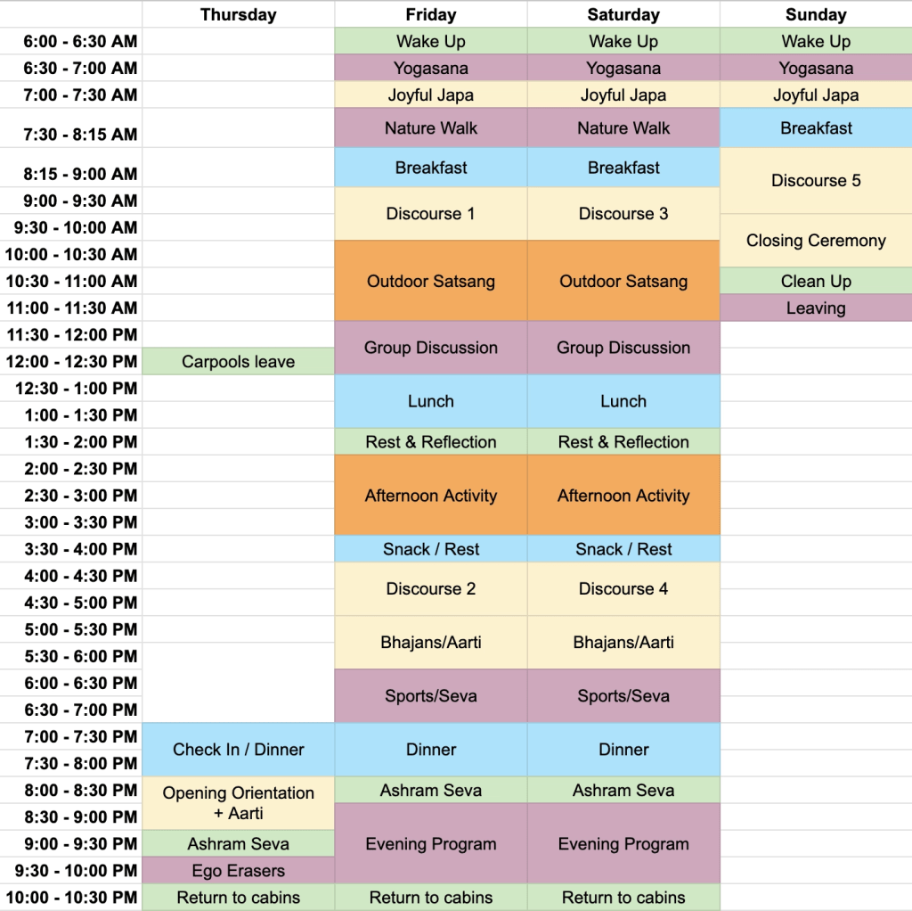 If you are traveling by plane, you should plan to fly in by 10am to San Jose (SJC) OR 11am to San Francisco (SFO) on Thursday Sept. 19th and fly out after 8pm (SJC) OR after 7pm (SFO) on Sunday Sept. 22nd to allow for driving time between the airport and ashram. If you would like to fly in on Wednesday and/or out on Monday, and are in need of accommodation on Wednesday or Sunday night, you can reach out to us at national-chyk-retreat@cmsj.org.